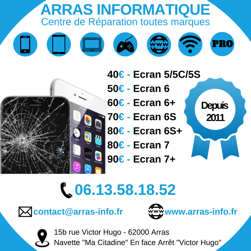 Atelier accessible depuis Lens, Douai, Béthune, Liévin, Hénin-Beaumont, Carvin, Avion, Achicourt, Beaurains, Saint-Laurent-Blangy et communes voisines du Pas-de-Calais. Arras Informatique & Mobile est un atelier local de réparation de téléphones, ordinateurs, tablettes et consoles de jeux situé à Arras - Artois - Pas de calais 62 .